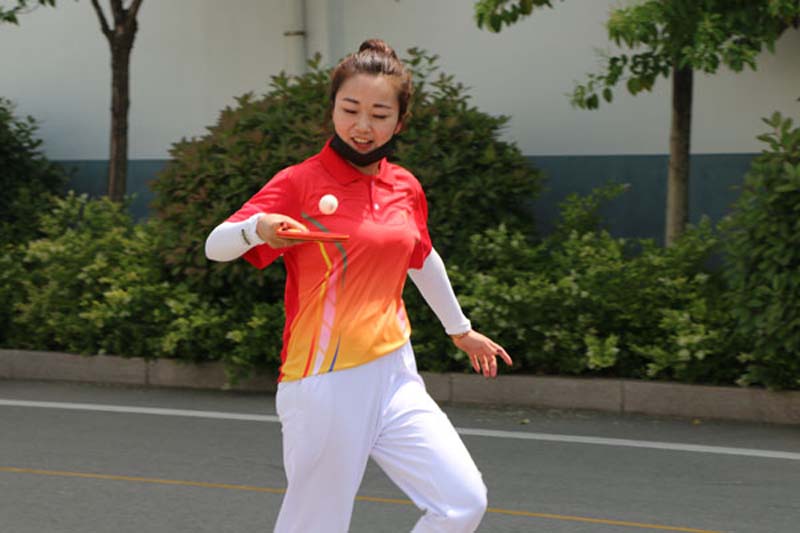 小球拍上托,脚下步伐活。凝神方寸间,稳住别掉落。