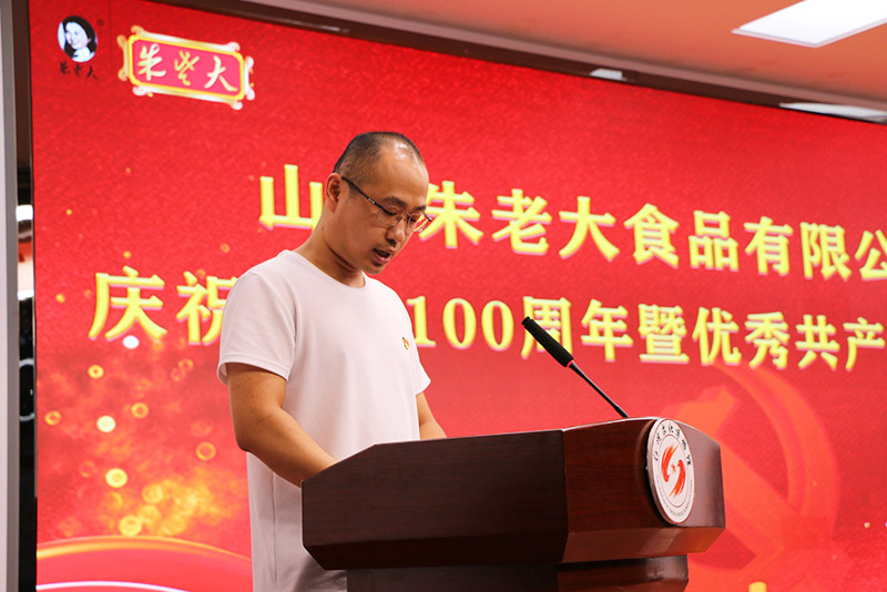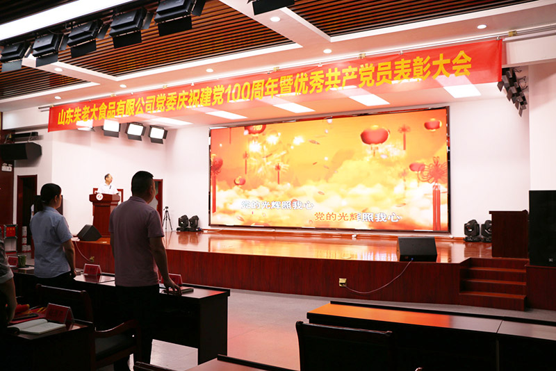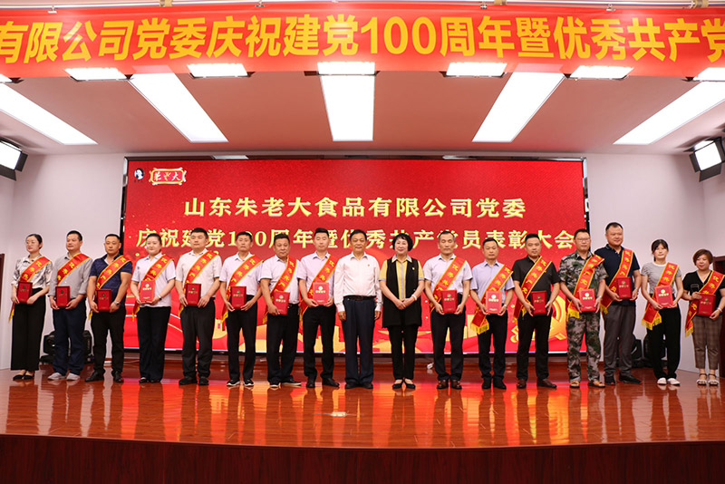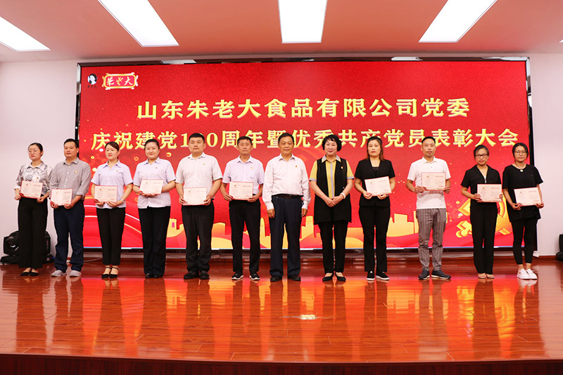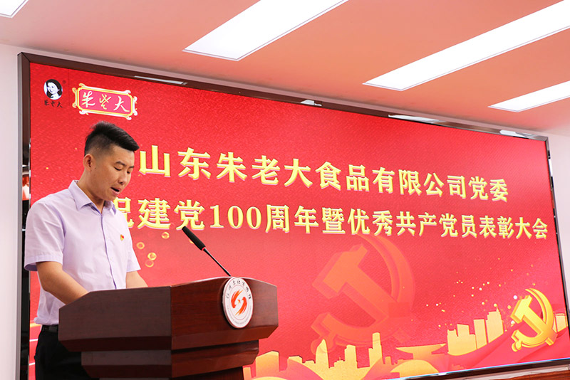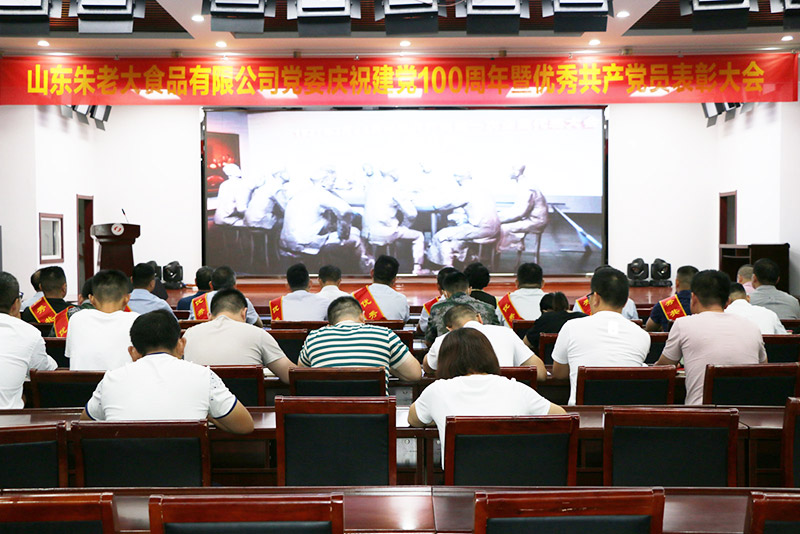 筚路蓝缕创伟业,初心不忘再起航。6月29日上午,山东朱老大食品有限公司六楼会议室灯光璀璨,中央舞台大型电子屏上,金色党徽在红色背景的映衬下熠熠生辉,公司党委庆祝建党100周年暨优秀共产党员表彰大会在这里隆重召开。公司党委书记朱呈镕,市派“红领书记”巩明文等领导与公司全体党员、入党积极分子一起,共同庆祝党的百年华诞,表彰优秀共产党员。公司党委副书记、工会主席朱桂锌主持会议。