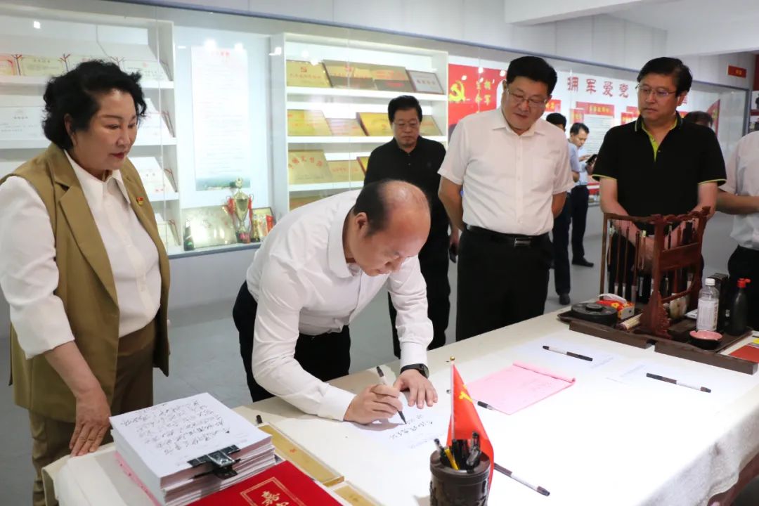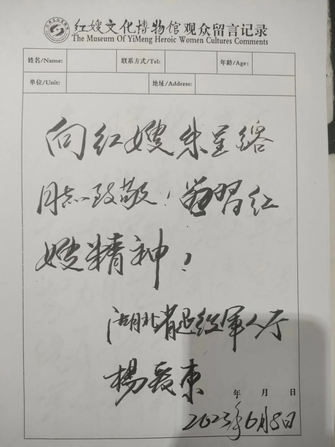 参观结束后,杨爱东厅长在留言簿上写下“向红嫂朱呈镕同志致敬!学习红嫂精神!”的参观感言。